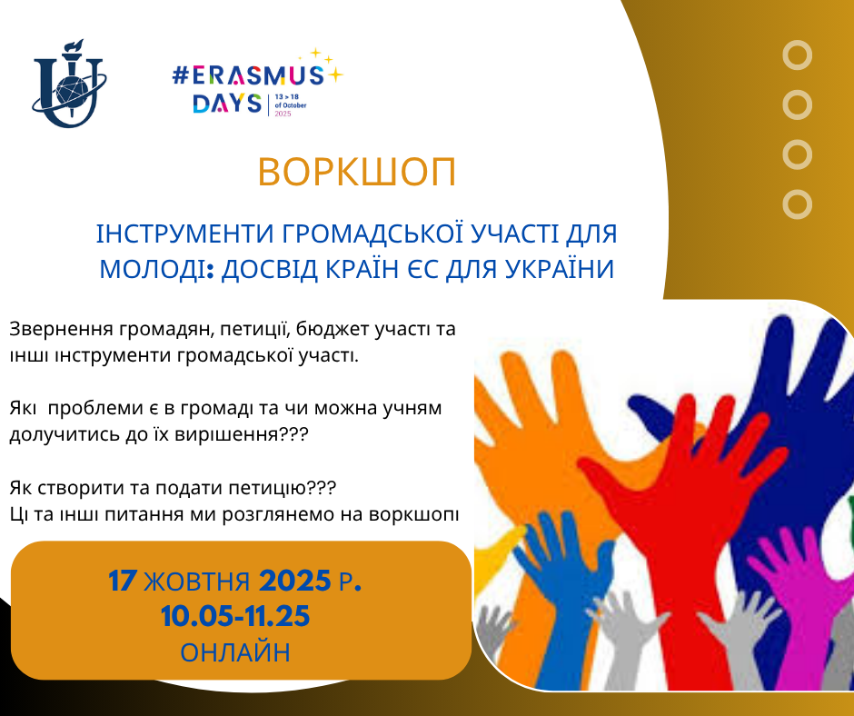Воркшоп проводиться в рамках #ErasmusDays, які відбудуться з 13 по 18 жовтня по всій Європі та світу, зокрема і в Україні! Кампанія 2025 р. зосереджена на цінностях Європейського Союзу під гаслом:#ErasmusDays2025: Живи нашими цінностями надихай майбутнє.