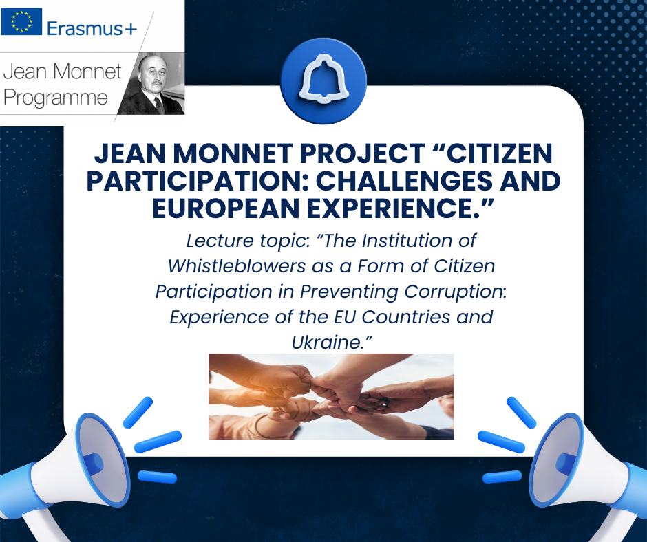 Lecture topic: “The Institution of Whistleblowers as a Form of Citizen Participation in Preventing Corruption: Experience of the EU Countries and Ukraine.”
