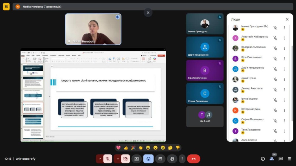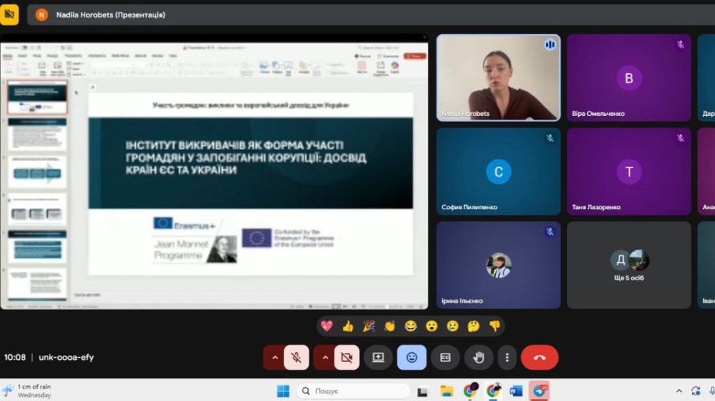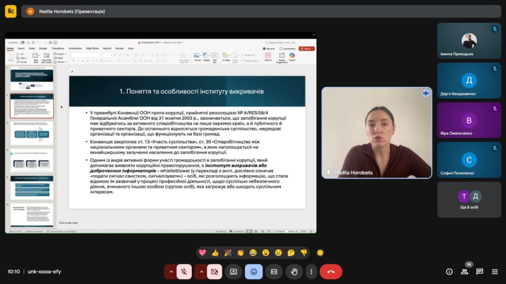Спікеркою заходу стала Надія Горобець, старший викладач кафедри, яка розкрила тему «Інститут викривачів як форма участі громадян у запобіганні корупції: досвід країн ЄС та України».