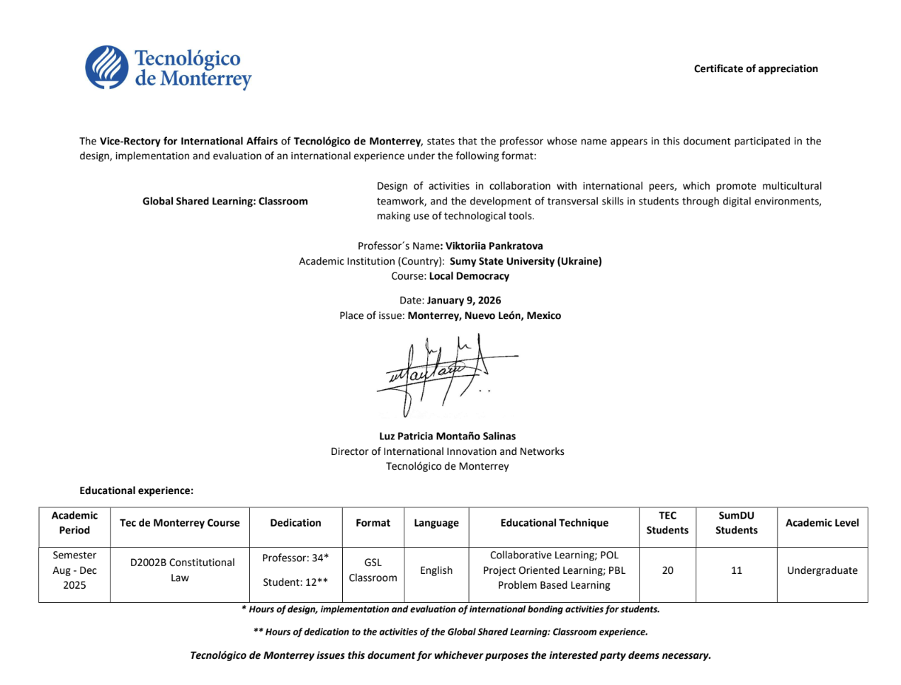 Доцент кафедри Вікторія Панкратова успішно пройшла навчання за професійною Сертифікатною програмою «Залучення громадян до врядування у територіальній громаді», яка тривала з 11 листопада по 03 грудня 2025 року.